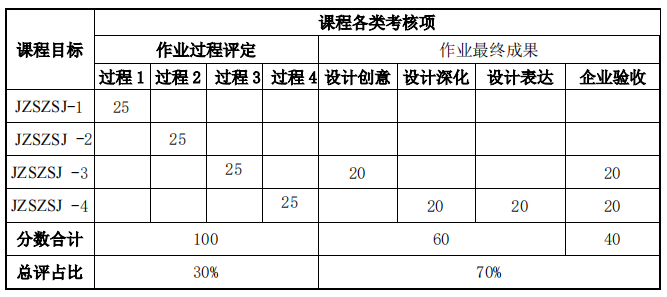 本课程考核采用设计大作业综合考核,作业过程成绩占30%、作业最终成果成绩占70%。设计大作业以组为单位完成,教师跟踪员工进度并提供指导。员工需要完成规定的作业和任务,结课成绩根据以下考核方案计算得到。
